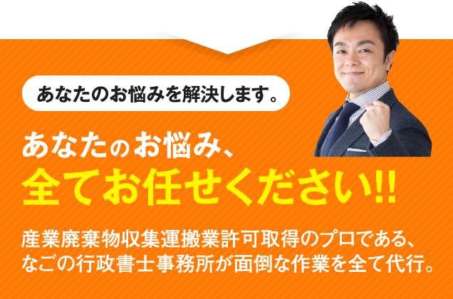 収集運搬業許可申請書の作成及び証明書類収集を速やかに行い、申請書類等に押印をいただきます。 当事務所への報酬及び証紙代のお振込みをお願いいたします。(許可が取得できなかった場合は、全額返金いたします。) |